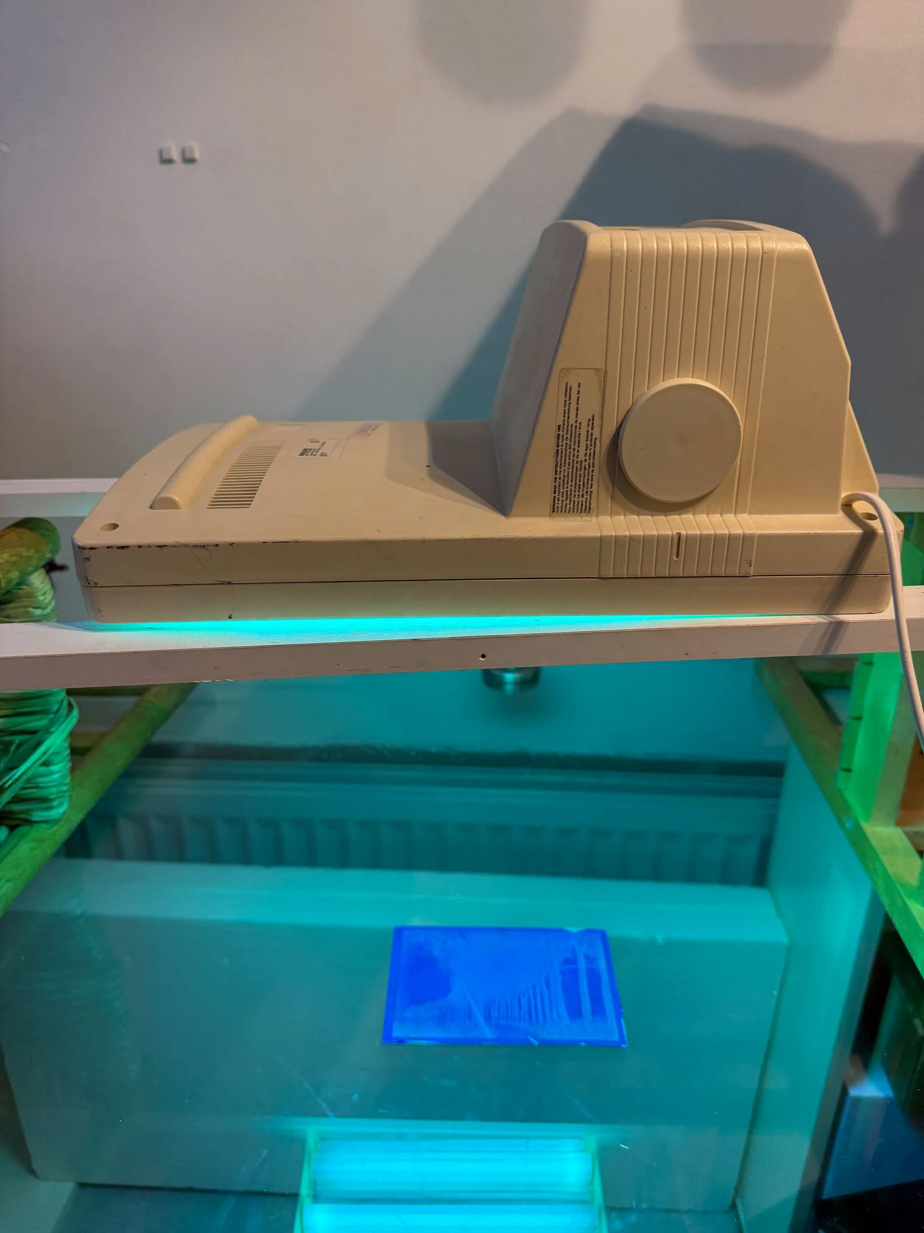 Stap 3: Het gelamineerde plaatje flink laten drogen, waarna het samen met de bedrukte sheet gedurende 28 seconden belicht wordt met een uv-lamp.