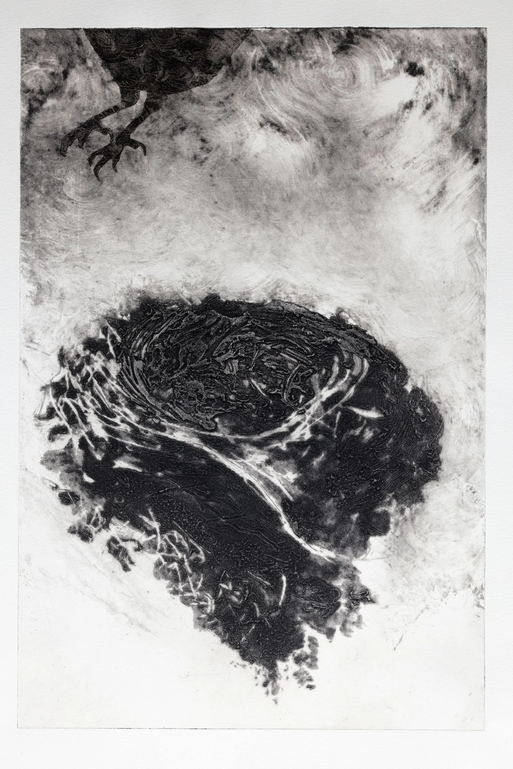 Deze maand ben ik begonnen met een cursus fotografie & etsen. Van mijn 4e tot mijn 18e leerde mijn moeder mij de techniek van het etsen, maar dat is inmiddels alweer een tijdje geleden. Van docente Pol Taverne kreeg ik een welkome opfriscursus, interessant genoeg met materialen waarmee ik nog niet eerder had gewerkt: op een transparante polyester plaat in combinatie met gesso en carborundum. Geïnspireerd op één van mijn eigen foto's, maakte ik deze ets.